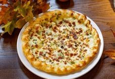 380 г • Открытый пирог: тесто (мука, дрожжи, соль, сахар, масло растительное, молоко), сыр сулугуни, лук зеленый, сметана, масло сливочное