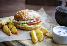 290/100/50 г • Бедро цыпленка, соль, перец черный молотый, паприка сладкая, соус сырный, томат, айсберг, шоти (мука, соль, сахар, дрожжи), кунжут, яйцо, картофельные дольки, соус мацони, петрушка