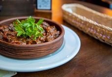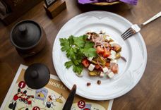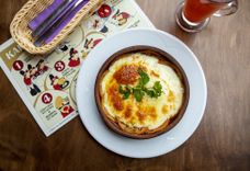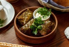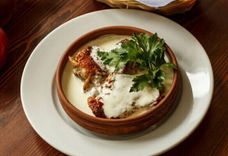 175 г • Баклажан, томат, сыр сулугуни, соус (масло растительное, чеснок, сок лимона, кинза, соль, перец Чили, хмели-сунели, уцхо-сунели), петрушка