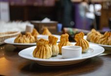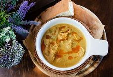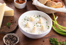 300 г • Мини хинкали с говядиной, куриный бульон, лук репчатый, картофель, морковь, сливки, сыр плавленый, молоко, масло сливочное, перец черный молотый, куркума, петрушка