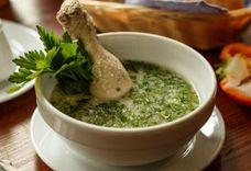 300 г • Куриный бульон, мякоть бедра, лук репчатый, яйцо, уксус винный, кинза, соль, перец черный молотый