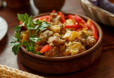200 г • Говядина, томат, перец болгарский, лук репчатый, соус сацебели, соль, перец черный молотый, чеснок, уцхо-сунели, хмели-сунели, перец чили, масло растительное
