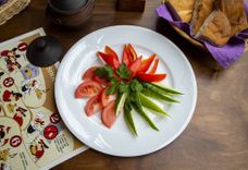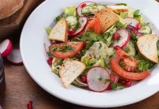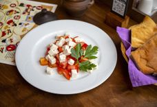 300 г • Перец болгарский, томат, огурец, редис, петрушка, кинза, лук зеленый, соус (масло растительное, чеснок, сок лимона, кинза, соль, перец Чили, хмели-сунели, уцхо-сунели), гранат