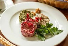 50 г • Свекла, ореховая паста (орех грецкий, соль, чеснок, перец Чили, уцхо-сунели, кинза, уксус винный красный), гранат, петрушка