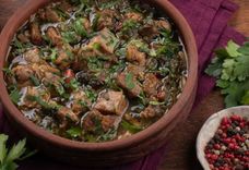 250 г • Баранина, лук репчатый, перец болгарский, соус ткемали, вино, эстрагон, лук зеленый, кинза, чеснок, перец Чили, уцхо-сунели, кориандр, масло сливочное, петрушка
