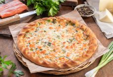 400 г • Открытый пирог: тесто (мука, дрожжи, соль, сахар, масло растительное, молоко), сыр сулугуни, лук зеленый, сметана, лосось, масло сливочное