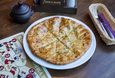 350 г • Открытый хачапури: тесто (мука, дрожжи, соль, сахар, масло растительное, молоко), сыр сулугуни, масло сливочное, соус (масло растительное, чеснок, сок лимона, кинза, соль, перец Чили, хмели-сунели, уцхо-сунели)